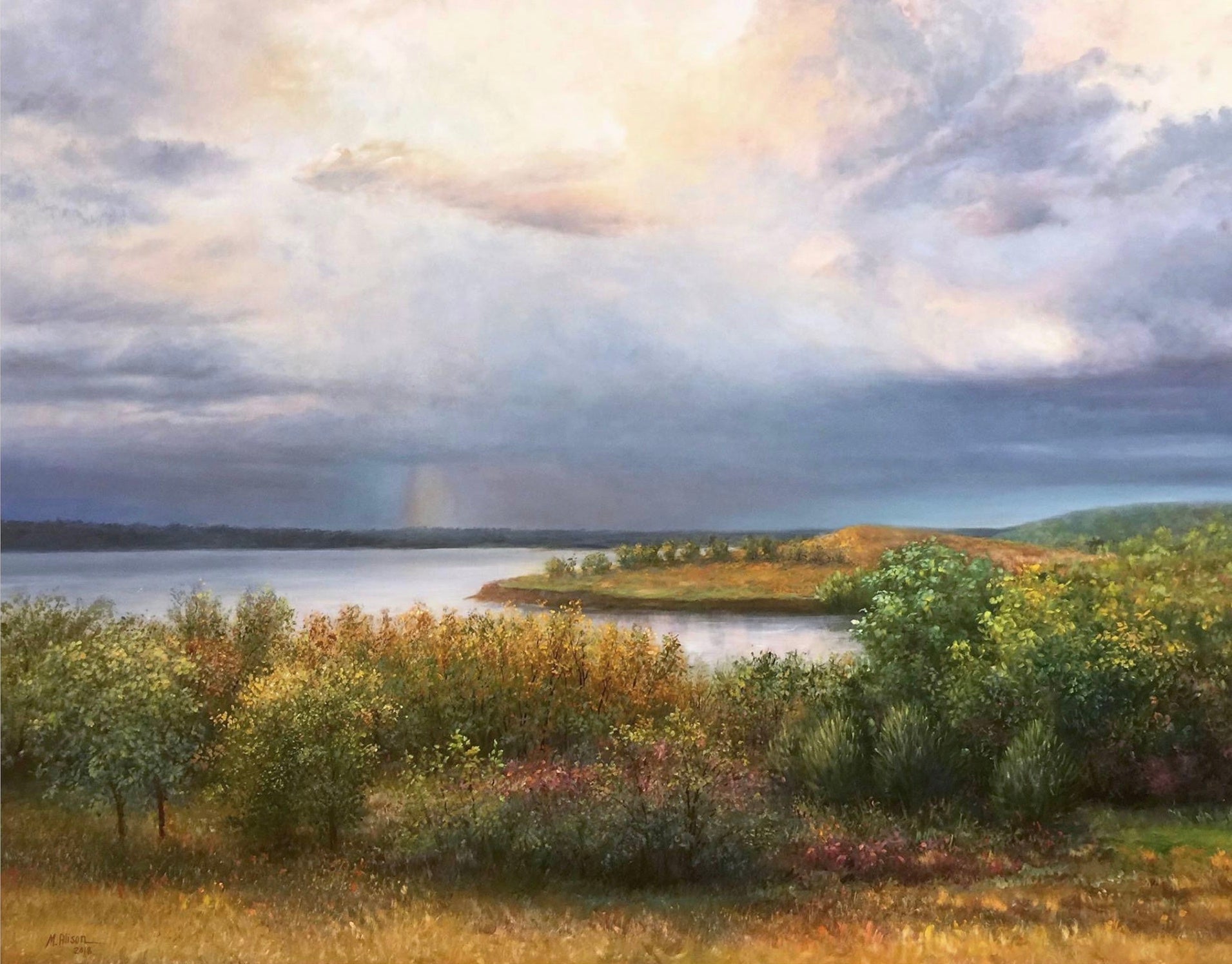 Description: Kansas landscape oil painting of Clinton Lake by Lawrence, Kansas artist Mehrzad Alison ( M. Alison )