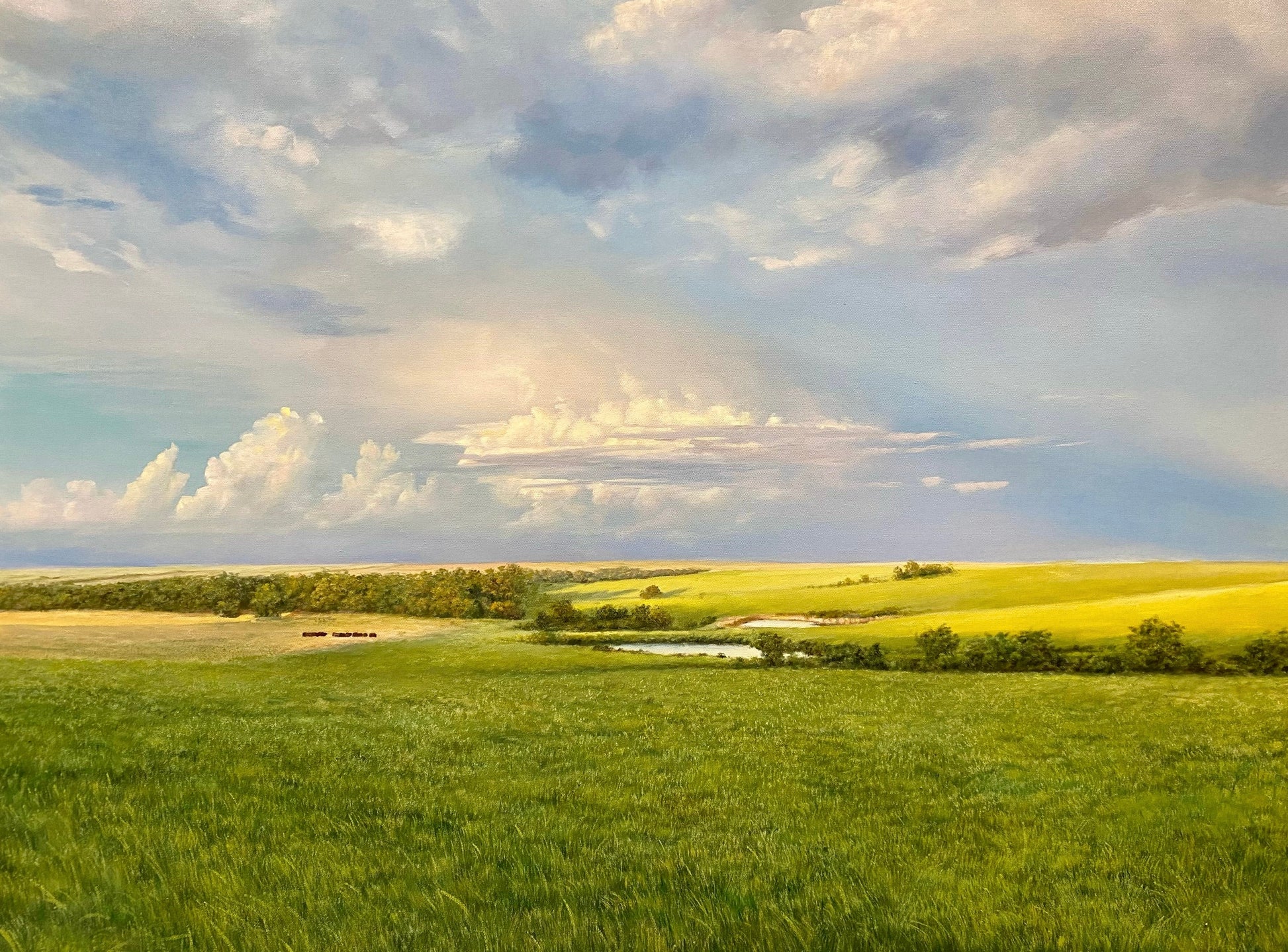 Description: Kansas Flint Hills landscape, late afternoon sky painting, South of Maple Hills. by Lawrence, Kansas artist, Mehrzad Alison ( M. Alison )