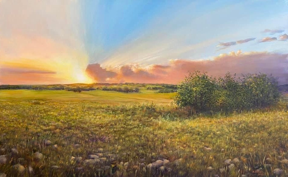 Description: Kansas Flint Hills landscape painting on canvas, Kansas prairies sunset landscape painting by Lawrence Kansas artist, Mehrzad Alison - M. Alison