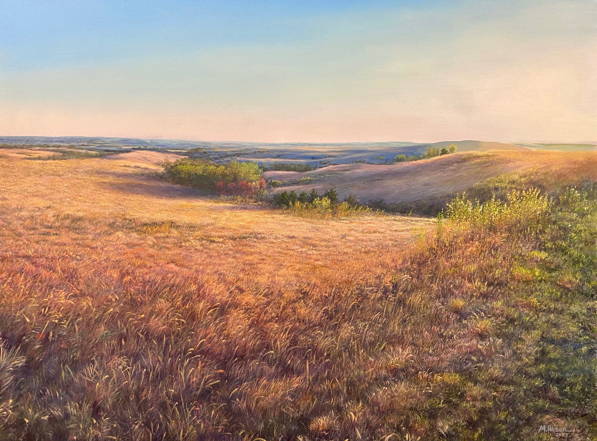 Description: Kansas Flint Hills landscape painting, Kansas prairies and morning sky east of Alma on Clapboard Ravine Road, by Lawrence, Kansas artist, Mehrzad Alison, ( M. Alison )