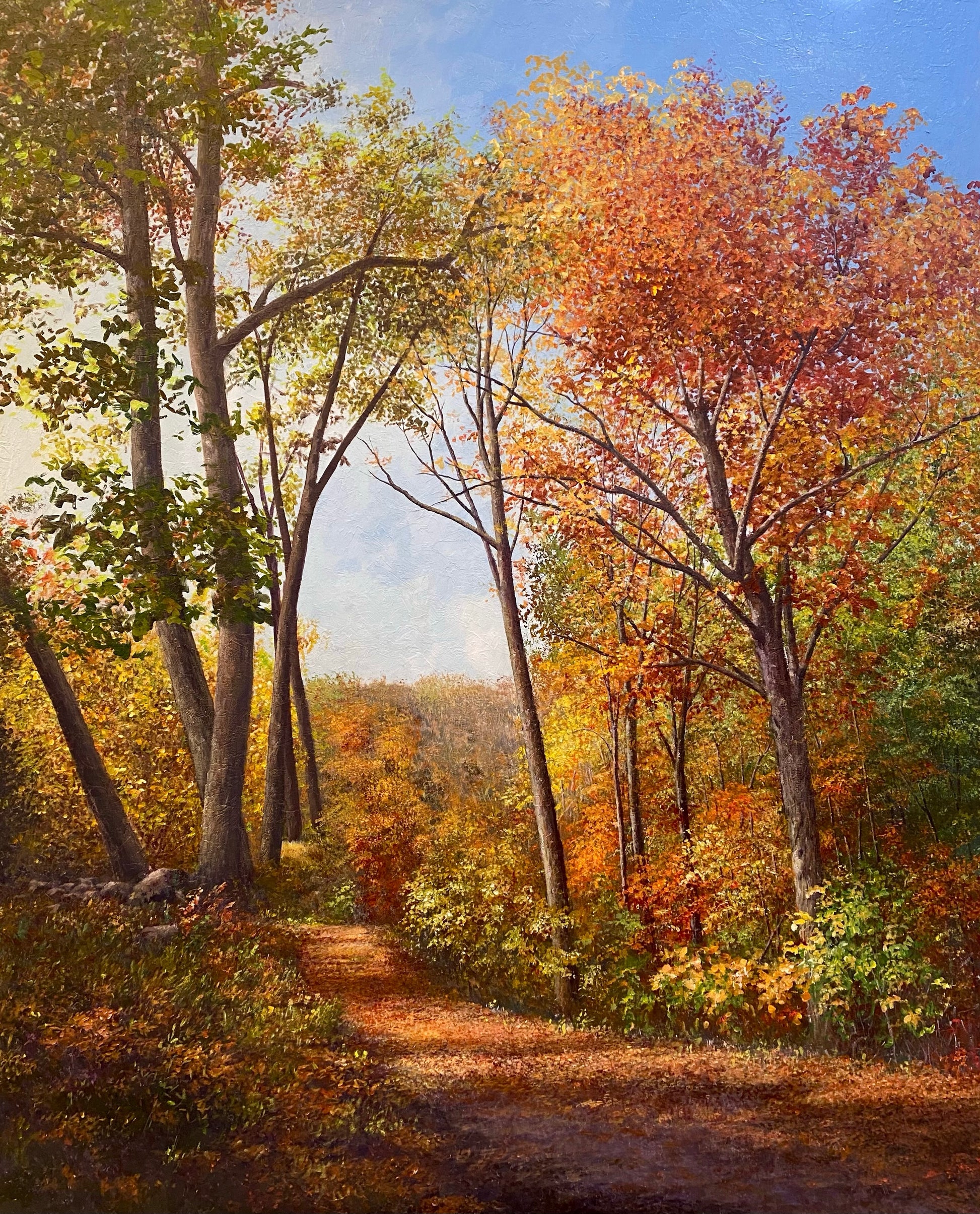 Description: Kansas early fall landscape painting on canvas, trail in Kansas prairies.