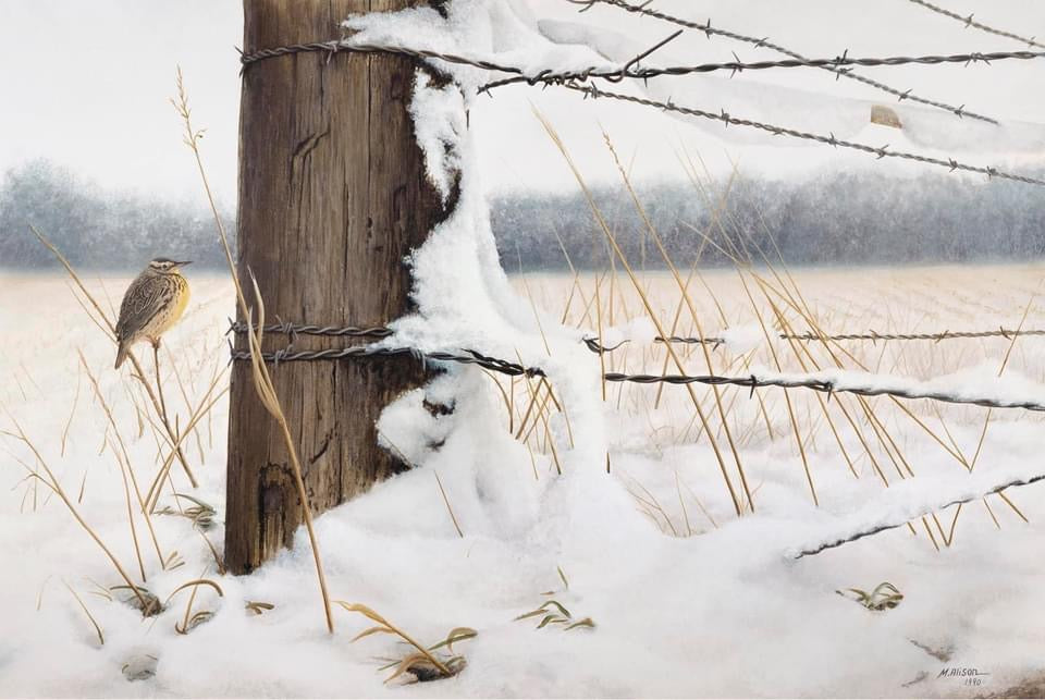 Description: Kansas winter snow farmland with Kansas Meadowlark landscape painting by, Mehrzad Alison, ( M. Alison ).