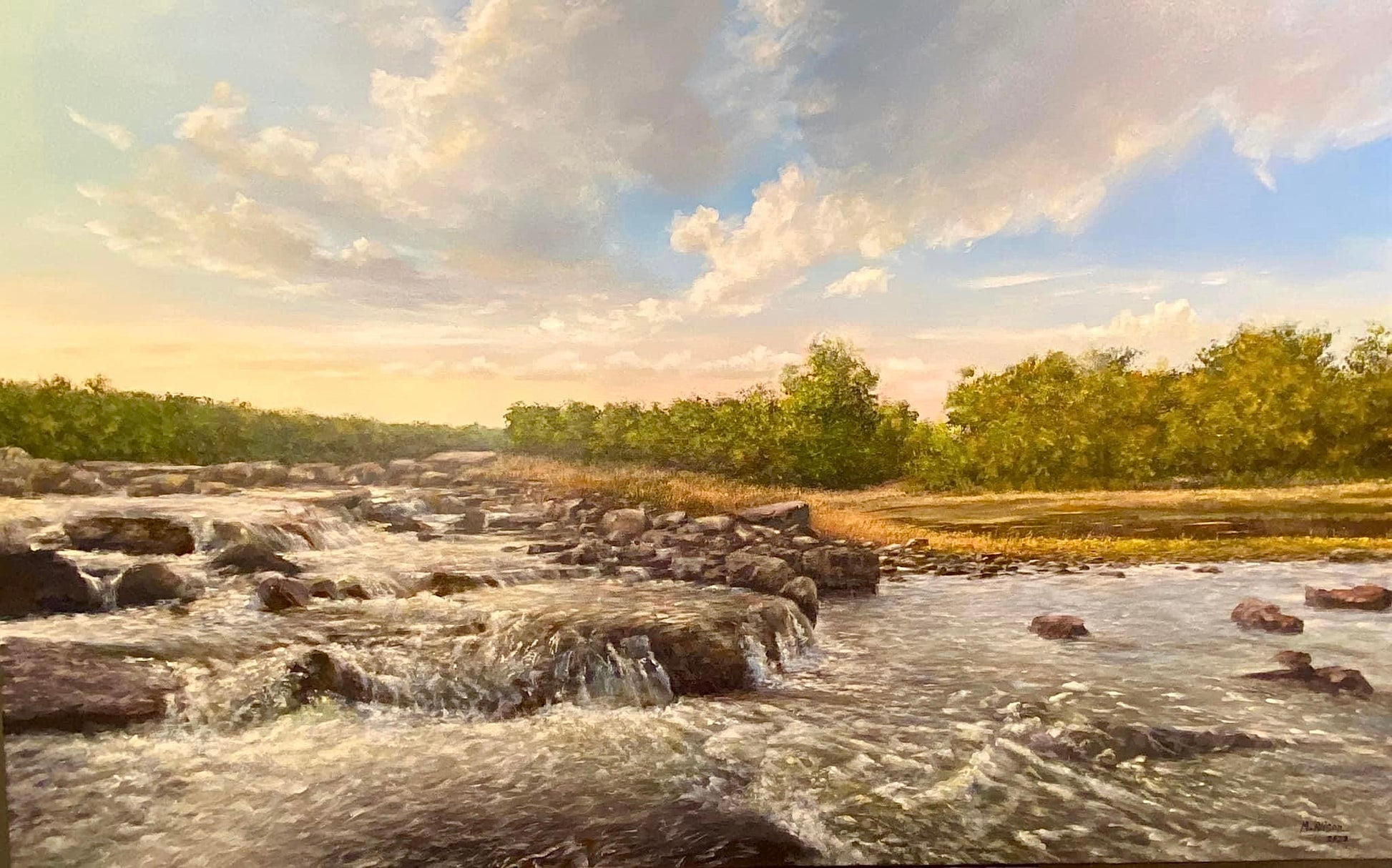 Description: Manhattan, Kansas, Rocky Ford, Tuttle Creek, landscape painting by Lawrence, Kansas artist, Mehrzad Alison, ( M. Alison ).