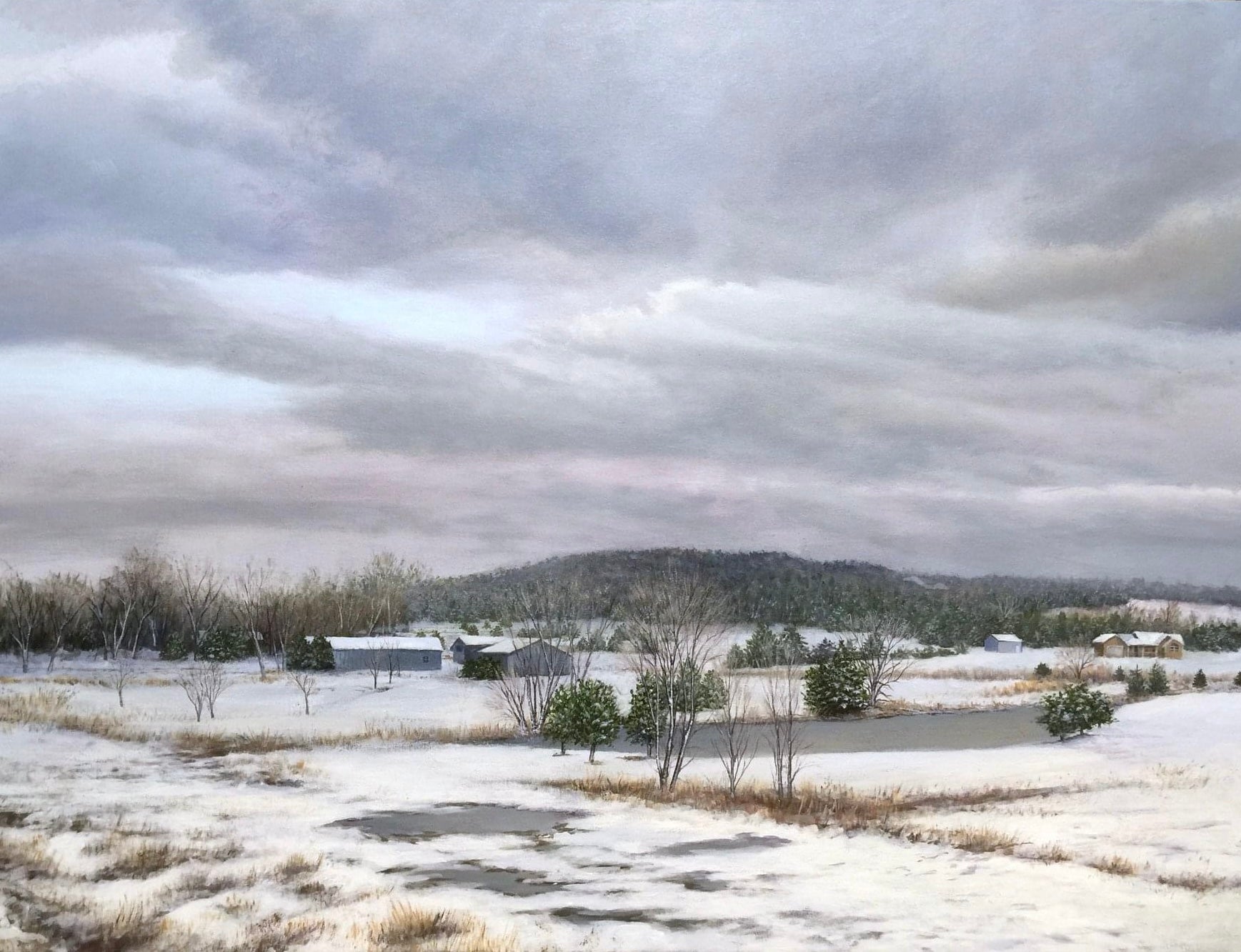 Description: Kansas winter farmland, frozen Kansas prairies painting by Lawrence, Kansas artist, Mehrzad Alison, ( M. Alison )
